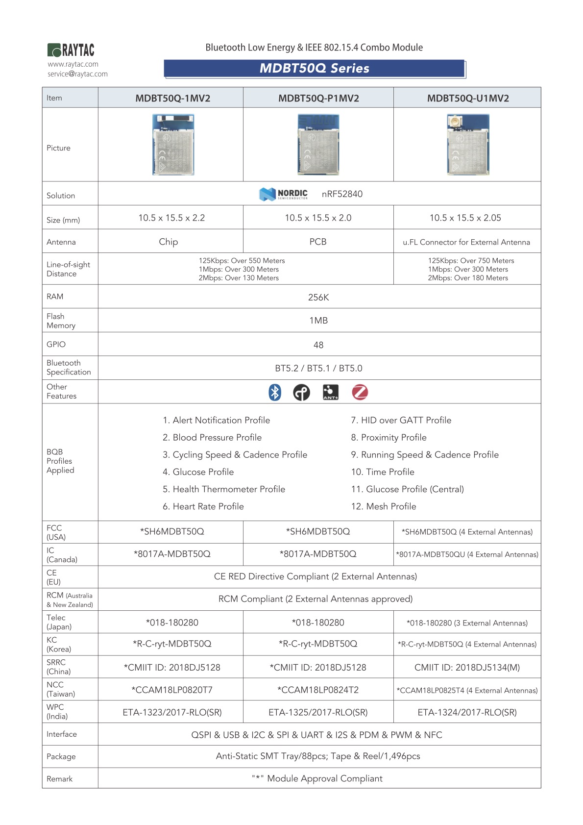 Raytac nRF52840 module spectrum covers MDBT50Q-1MV2, MDBT50Q-P1MV2 and MDBT50Q-U1MV2 series with Chip Antenna, PCB Antenna and u.FL connector for External Antenna option for selection.